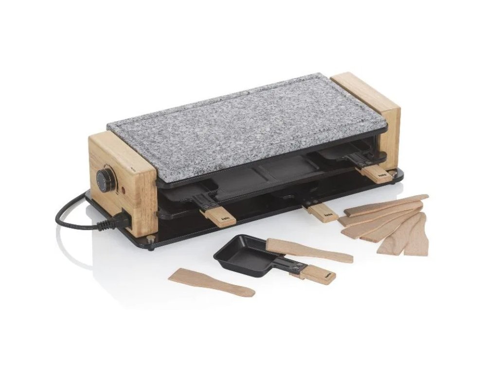Součástí balení je 8 raclettových pánviček a 8 dřevěných lopatek, takže si každý host může připravit vlastní kombinaci podle chuti. Díky extra dlouhému 2m napájecímu kabelu máte větší volnost při umístění grilu.
